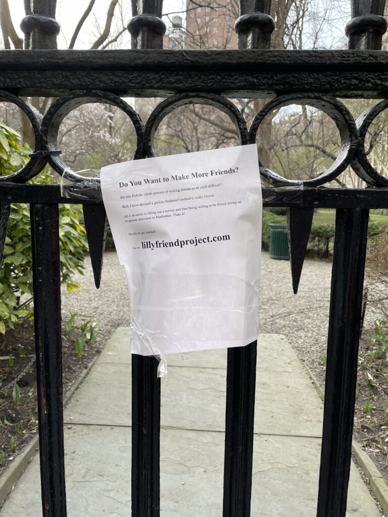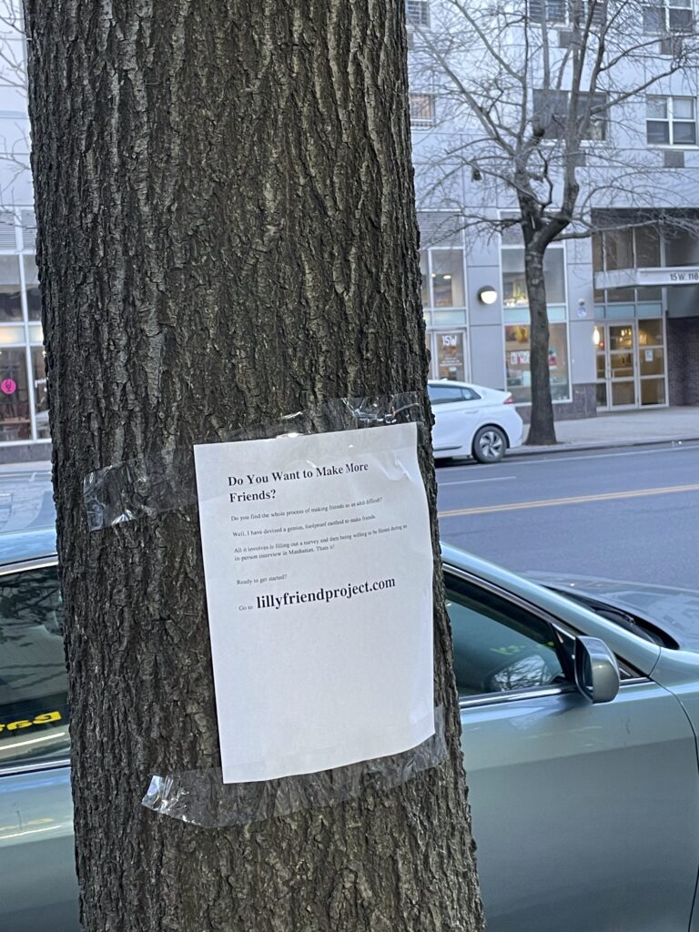 In November 2023, Lilly had an idea that she couldn’t un-have. In February 2023, she put up 400 flyers around New York City asking strangers to apply to be her friend.