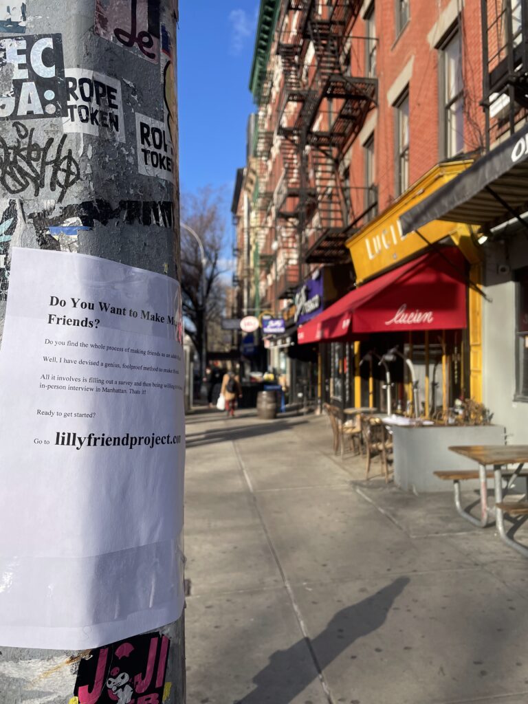 In November 2023, Lilly had an idea that she couldn’t un-have. In February 2023, she put up 400 flyers around New York City asking strangers to apply to be her friend.